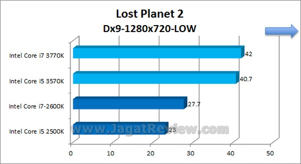 Lost Planet 2 adalah salah satu game 3rd person action yang cukup populer di pasaran. Maka dari itu kami menggunakan game ini sebagai salah satu barometer performa bagi pengujian hardware. Pengujian kami lakukan di mode DirectX 9.0 dan DirectX 11.0 menggunakan benchmark internal dari game ini sendiri.