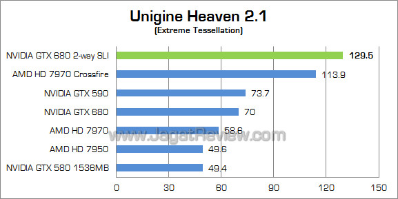 Di aplikasi benchmark sintesis DirectX 11 ini, GTX 680 kedua memberikan peningkatan performa sekitar 94%.