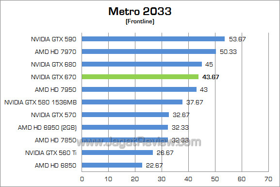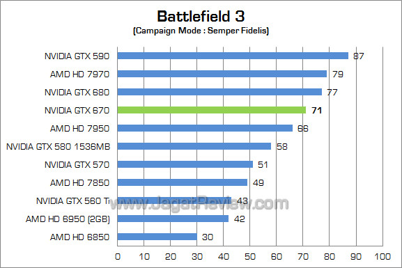 GTX 670 kembali mengungguli GTX 570 dan HD 7950 di game FPS berbasis engine Frostbite 2.0 ini. GTX 670 unggul sekitar 39% atas GTX 570 dan sekitar 7% atas HD 7950. Meskipun begitu, performa GTX 670 tertinggal sekitar 8% di belakang GTX 680.