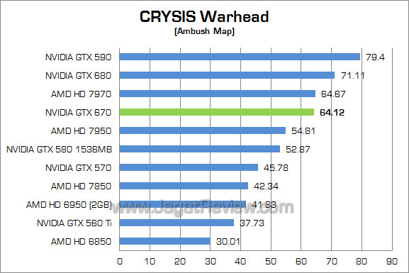 Pada game FPS berbasis Cry Engine 2.0 ini, meskipun tertinggal sekitar 10% di belakang GTX 680, GTX 670 tetap mampu mengungguli performa GTX 570 sekitar 40% dan 16% atas HD 7950. Tidak disangka GTX 670 ternyata hanya terpaut tipis atas HD 7970.