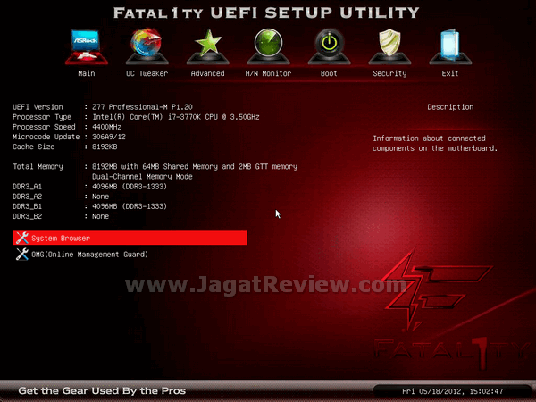 Fatal1ty Z77 Professional-M menghadirkan UEFI BIOS khas ASRock yang dikombinasikan dengan theme khas seri “Fatal1ty”. Navigasi menu pada BIOS motherboard ini tergolong mudah dan juga responsif.