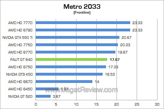 Performa Palit GT 640 2GB bersaing ketat dengan HD 6670 GDDR5 pada game DirectX 11 ini. Meskipun kurang bertenaga di resolusi gambar Full HD, Palit GT 640 2GB mampu menghasilkan frame rate di atas 30 fps pada resolusi gambar 1360×768.