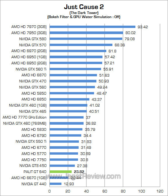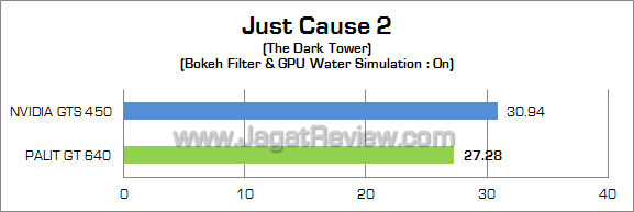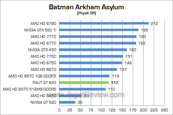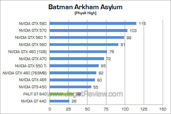 Pada dua resolusi gambar, bahkan dengan setting PhysX High, Palit GT 640 2GB mampu menghasilkan frame rate di atas 30 fps.