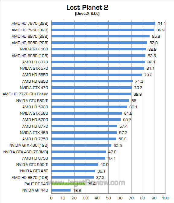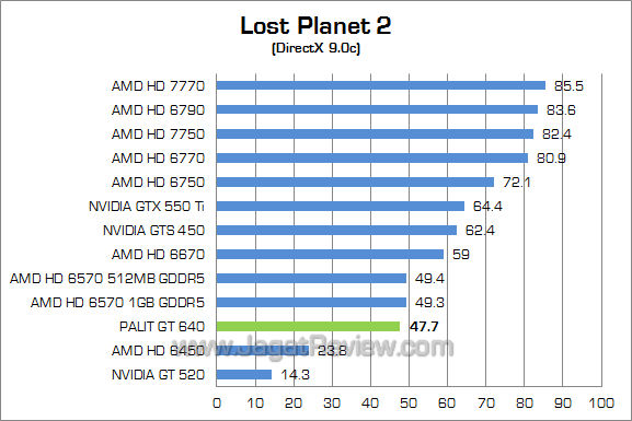 Frame rate yang dihasilkan Palit GT 640 2GB ternyata hampir menyentuh angka 30 fps pada resolusi gambar Full HD. Bahkan Palit GT 640 2GB menempel ketat performa HD 6750.