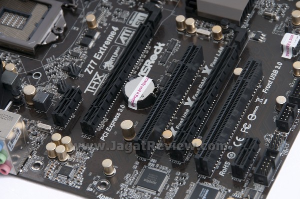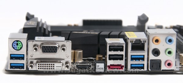 Tombol Clear CMOS pada bagian ini tentu akan memudahkan pengguna jika ingin me-reset setting BIOS tanpa perlu repot membuka casing. Sementara itu empat buah port USB 3.0, dua di antaranya diakomodir chipset Intel Z77 dan dua lagi diakomodir chip ASMedia ASM1042.