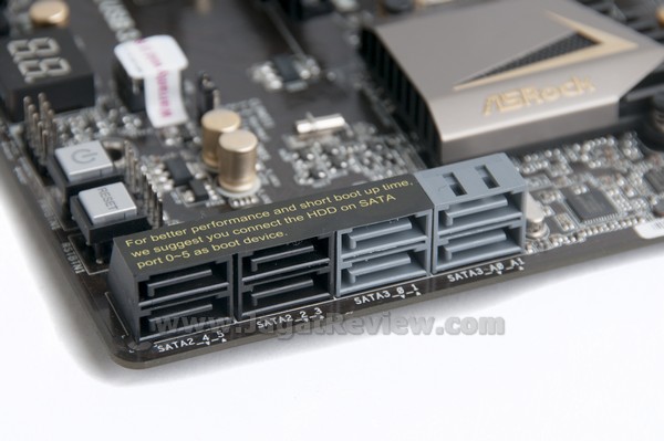 Empat port SATA 3Gbps (hitam) dan dua port SATA 6gbps (abu-abu) di sebelahnya diakomodir chipset Intel Z77. Sedangkan dua port SATA 6Gbps paling kanan diakomodir chip ASMedia ASM1061. Port SATA3_A1 (port paling kanan nomor dua) berbagi pemakaian dengan port eSATA pada backpanel sehingga apabila Anda menggunakan port SATA tersebut maka port eSATA tidak dapat digunakan, begitu pula sebaliknya.