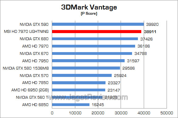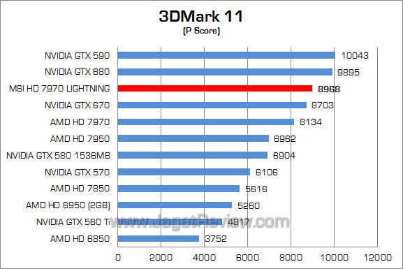 MSI HD 7970 Lightning melesat 9% lebih kencang dibandingkan HD 7970 pada benchmark sintesis DirectX 10 ini. Bahkan graphics card ini mampu melampaui performa GTX 680.