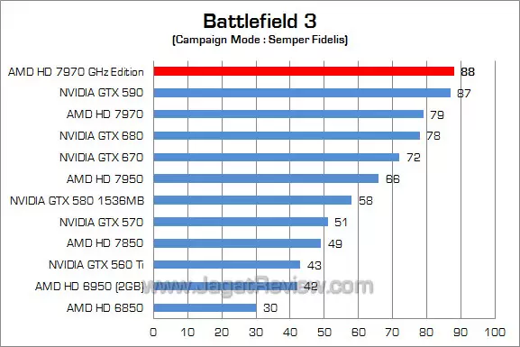 Game FPS dengan engine Frostbite 2.0 ini mampu berjalan 11% lebih kencang pada HD 7970 GHz Edition dibandingkan pada GTX 680. Tidak hanya itu, selisih performa sekitar 11% juga terlihat pada HD 7970 GHz Edition melawan HD 7970.