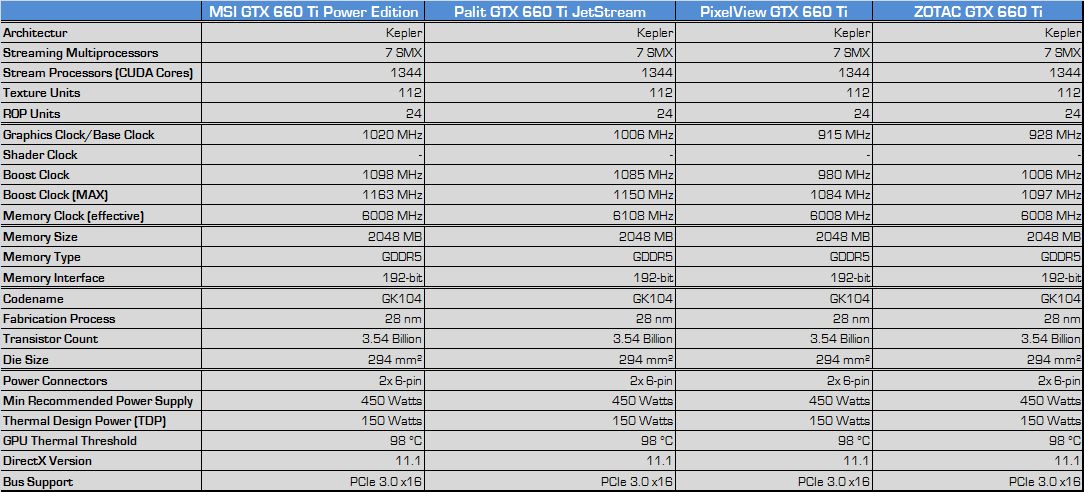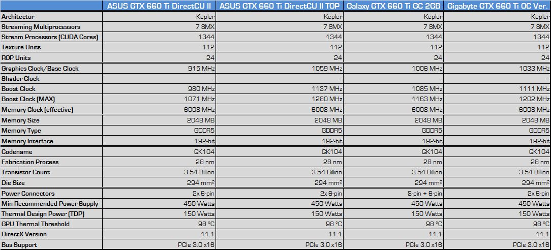 Total terdapat 8 buah GeForce GTX 660 Ti dari 7 merk berbeda yang akan menjadi subjek pengujian tes perbandingan kali ini. Tidak seperti kedua pendahulunya GTX 680 dan GTX 670 yang pada umumnya datang dengan wujud dan desain standar reference NVIDIA, graphics card GTX 660 Ti dari semua produsen ini sudah menggunakan desain “signature” khas mereka masing-masing pada penampilan perdananya, bahkan spesifikasi yang diusung pun mostly merupakan spesifikasi Pre-OC (factory overclocked).