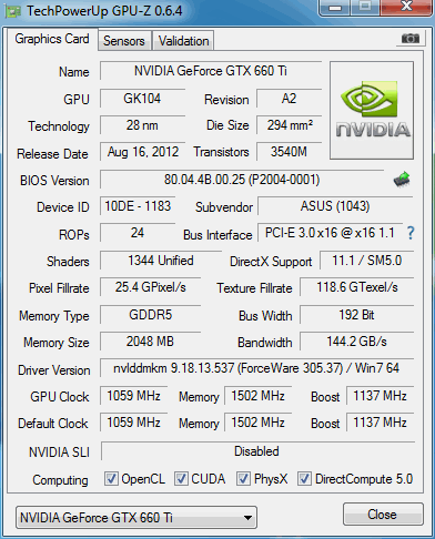 Seperti yang kami sebutkan di atas, kedua sampel graphics card dari ASUS ini identik secara fisik, tetapi perbedaan terletak pada spesifikasi yang digunakannya. Pada sampel pertama ASUS GTX 660 Ti DirectCU II, GPU dan memory clock yang digunakan merupakan spesifikasi standar dari GTX 660 Ti reference (915MHz/1502MHz), boost clock maksimal yang dapat dicapai yang kami catat pada saat pengujian adalah 1071 MHz.