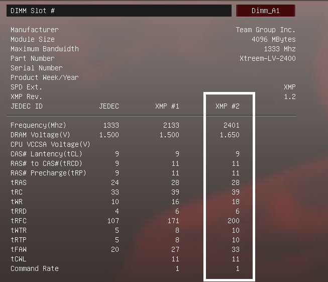 Berikut ini timing XMP pada ram Team Xtreem LV 2400 CL9, sesuai dengan yang dibaca di BIOS:
