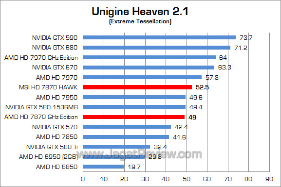 HD 7870 GHz Edition kembali bersain ketat dengan GTX 580 pada benchmark yang mengumbar Tessellation DirectX 11 ini. Sementara itu, MSI HD 7870 HAWK mampu melesat 7% lebih kencang dibandingkan versi reference dan lagi-lagi mampu mengungguli performa GTX 580 dan HD 7950.