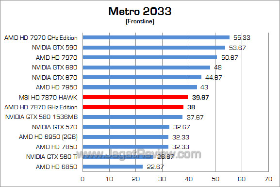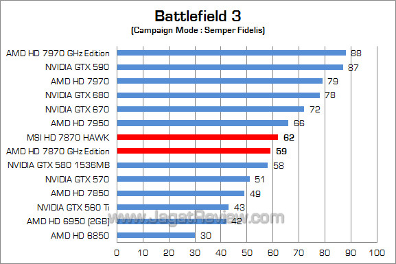 Tertinggal di benchmark sintesis, HD 7870 GHz Edition memutarbalikkan keadaan dengan keunggulan atas GTX 580 meskipun tidak terlalu jauh. Untuk MSI HD 7870 HAWK, graphics card ini mampu menunjukkan keunggulan performa sekitar 5% pada game dengan engine Frostbite 2.0 ini.