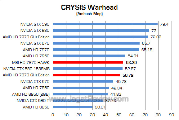 Performa HD 7870 GHz Edition kembali berada dibelakang GTX 580 pada game FPS kreasi studio Crytek ini. Sementara itu, MSI HD 7870 HAWK mampu memberikan performa 5% lebih tinggi dibandingkan versi reference Pitcairn XT.