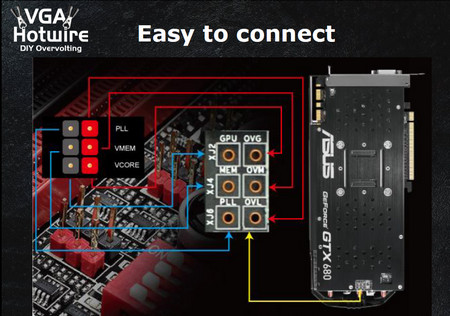 ASUS GTX 680 DirectCU II TOP dilengkapi feature VGA Hotwire. Feature ini memungkinkan pengguna untuk memonitor dan mengontrol voltase graphics card melalui motherboard ASUS seri ROG (Republic Of Gamer). Untuk menggunakan feature ini, pengguna diharuskan menyolder kabel pada titik VGA Hotwire pada graphics card untuk kemudian dihubungkan ke motherboard.