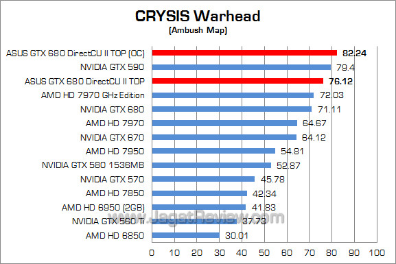 Pada game FPS berbasis Cry Engine 2.0 ini, ASUS GTX 680 DirectCU II TOP memiliki performa 7% lebih kencang dibandingkan GTX 680 default dan mampu meningkat lagi sekitar 8% setelah graphics card ini ditingkatkan spesifikasi clock-nya.