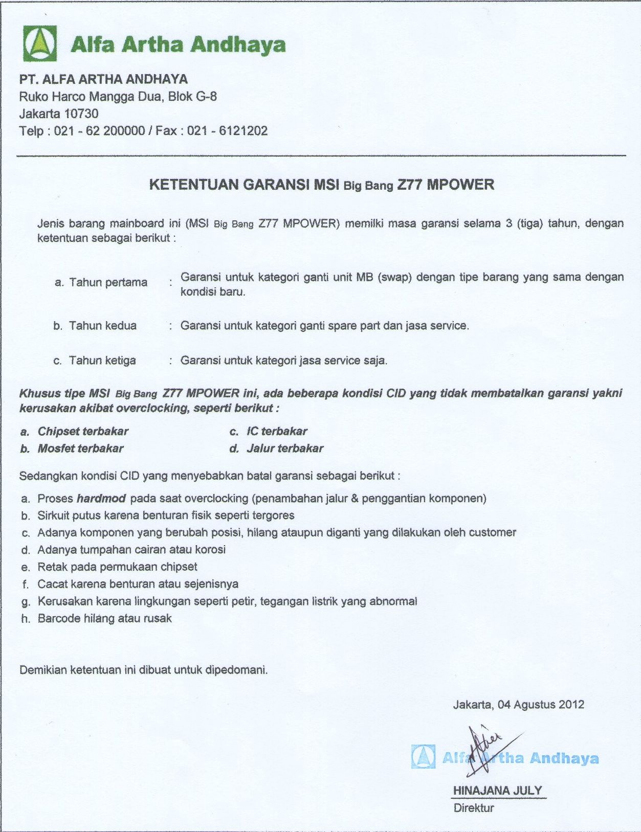 Berikut statemen dari PT. Alfa Artha Andhaya mengenai ketentuan garansi MSI Big Bang Z77 MPOWER yang didalamnya terdapat klausul garansi tersebut.