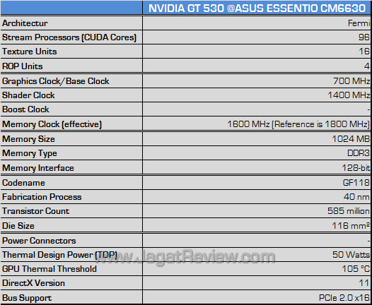 GeForce GT 530 (OEM) pada ASUS Essentio CM6630 dipersenjatai chip GPU GF118 dengan clock GPU sebesar 700 MHz. Memori yang digunakan adalah DDR3 dengan kapasitas 1GB dan clock memori sebesar 1600 MHz (200 MHz lebih rendah dibandingkan clock memori reference, 1800 MHz).