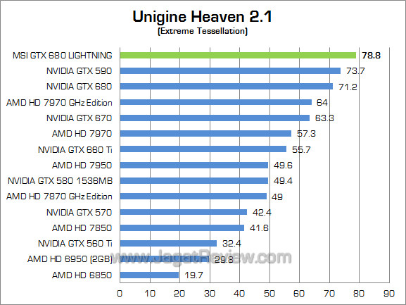 Spesifikasi clock MSI GTX 680 Lightning memberikan performa sekitar 10% lebih kencang dibandingkan GTX 680 reference pada benchmark dengan menu utama Tessellation DirectX 11 ini.