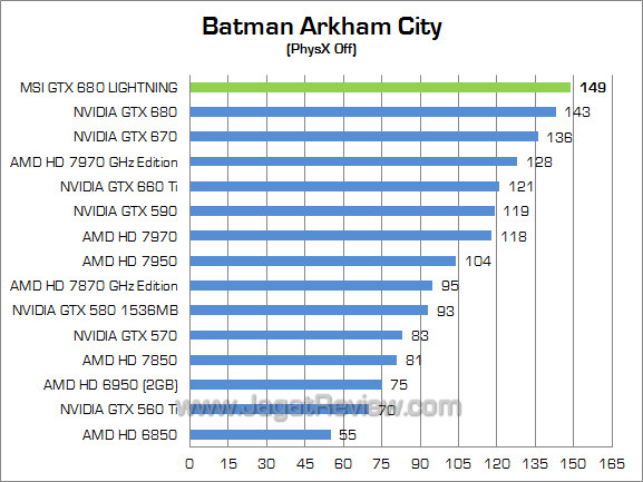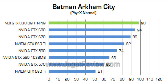 Pada game bertema superhero yang menggunakan engine Unreal ini, MSI GTX 680 Lightning menawarkan performa sekitar 4% lebih kencang dibandingkan GTX 680 reference.