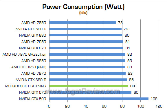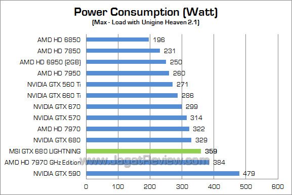 Dengan peningkatan performa mencapai 13%, konsumsi daya MSI GTX 680 Lightning meningkat sekitar 8% pada kondisi full-load dan 7% pada kondisi idle.