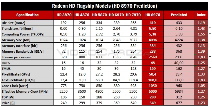 Videocardz.com membuat analisa (tabel merah) spesifikasi graphics card HD 8970 ini berdasarkan spesifikasi lima generasi graphics card radeon kelas high end sebelumnya. Ukuran Die Size GPU yang membesar menjadi 410 mm persegi untuk memuat 5,5 milyar transistor yang masih menggunakan fabrikasi 28nm, tambahan 512 shader stream processor, 16 ROP, dan 32 TMU dibandingkan HD 7970, dengan standar video ram yang kini meningkat menjadi 4GB. Tentu saja informasi pada tabel diatas tersebut hanya sebatas analisa saja, dan masih belum bisa dipastikan keakuratannya, bahkan para pembaca JagatReview pun bisa membuat analisa sendiri untuk graphics card NextGen AMD ini, mari kita diskusikan!