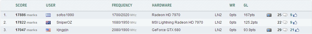 Tentunya, performance improvement dari driver baru ini disambut baik oleh para overclocker yang gemar adu tinggi skor benchmark 3DMark 11. Skor 3DMark 11 World Record yang terdahulu dibuat oleh k|ngp|n dengan GTX 680-nya menjadi ‘korban’ Update driver AMD ini. Pada saat artikel ini dirilis, sudah ada 2(dua) skor menggunakan VGA AMD Radeon HD 7970 yang mengalahkan World Record sebelumnya berkat driver baru, Kedua skor tersebut dicatatkan oleh sofos1990 dari Yunani, dan SniperOZ dari Australia.