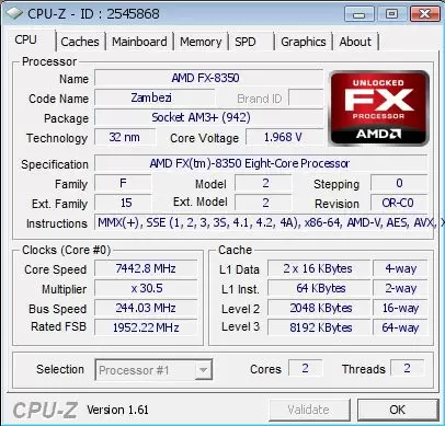 Kecepatan ini diraih pada motherboard Gigabyte 990FXA-UD7, VCore sebesar 1.968V, bus speed 244.03Mhz, dan menggunakan pendingin Liquid Nitrogen. Si Overclocker juga mematikan sebagian modul yang ada pada CPU AMD Vishera, dan menyisakan hanya 1 (satu) modul yang aktif.