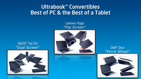 Setiap produsen memiliki cara mereka masing-masing untuk menciptakan produk Ultrabook Convertible. Seperti ASUS Taichi dengan fitur dual-screen, Lenovo Yoga dengan fitur Flip Screen, atau Dell Duo dengan fitur Ferris Wheel.