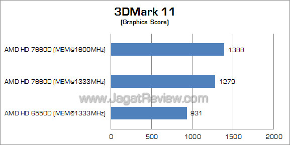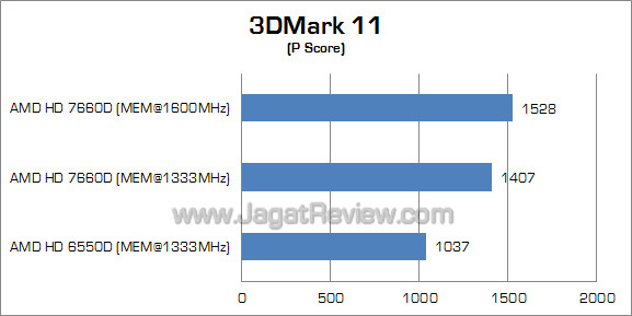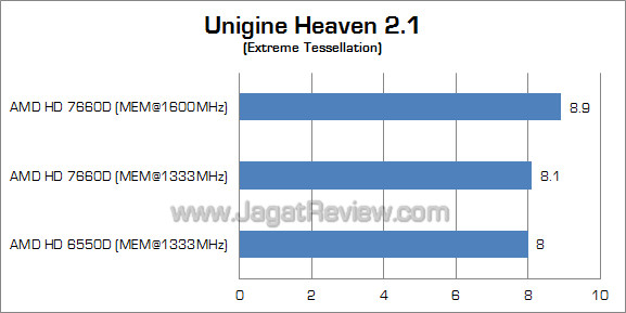 Berbeda dengan dua benchmark sintesis sebelumnya, selisih performa HD 7660D dan HD 6550D hampir tidak terlihat di benchmark dengan sajian utama Tessellation ini. Meskipun begitu, meningkatkan kecepatan memori tetap mendongkrak performa HD 7660D sebesar 9%.