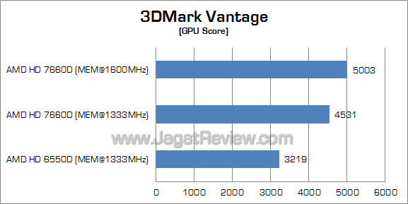 Pada benchmark sintesis DirectX 10 ini, performa HD 7660D lebih kencang sekitar 40% dibandingkan HD 6550D, mengesankan. Sedangkan saat kami menaikkan kecepatan memori ke 1600 MHz, performa HD 7660D meningkat sekitar 10%.
