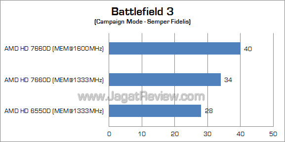 Dengan setting di atas, HD 7660D ternyata mampu menjalankan game Frostbite 2.0 ini pada frame rate di atas 30 fps. Frame rate HD 7660D sendiri unggul sekitar 21% diatas HD 6550D. Meningkatkan kecepatan memori ternyata mampu mendongkrak performa HD 7660D sekitar 17% dan membuat frame rate menembus angka 40 fps.