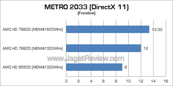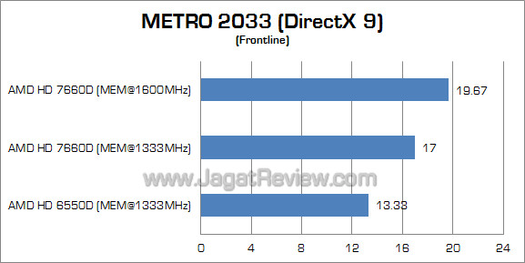 Walaupun sudah menggunakan mode DirectX 9, ternyata HD 7660D masih kurang bertenaga untuk menembus frame rate di atas 30 fps. Meskipun begitu, pengujian di game ini memperlihatkan HD 7660D memiliki performa sekitar 33% lebih tinggi dibandingkan HD 6550D dan 11% lebih tinggi saat kami tingkatkan kecepatan memori ke 1600MHz.