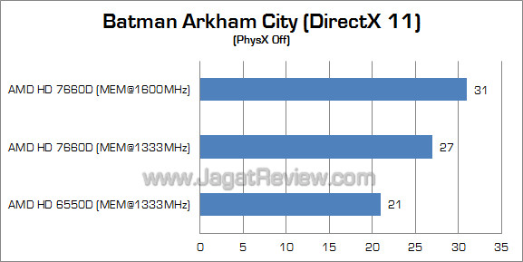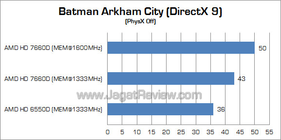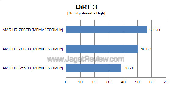 Pada kualitas grafik Ultra performa HD 7660D ternyata berada di bawah HD 6550D. Bisa jadi hal ini disebabkan oleh driver perdana yang masih belum matang. Meskipun begitu pada kualitas grafik High, game ini mampu dijalankan pada frame rate di atas 50 fps oleh HD 7660D dan performa seperti ini 30% lebih tinggi di atas HD 6550D. Kecepatan memori lebih tinggi kembali mampu mendongkrak performa HD 7660D sekitar 14%.