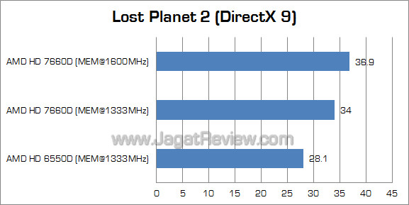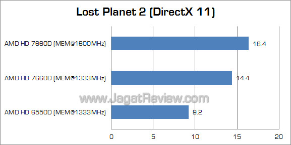 Pada mode DirectX 9, game action berbasis Unreal Engine 3.0 ini mampu dijalankan pada frame rate di atas 40 fps oleh HD 7660D. Bahkan frame rate dapat menembus 50 fps saat kami naikkan kecepatan memorinya. Untuk urusan perbandingan performa, HD 7660D 28% lebih bertenaga dibandingkan HD 6550D dan dapat ditingkatkan lagi hingga sekitar 16% saat kecepatan memori ditingkatkan.