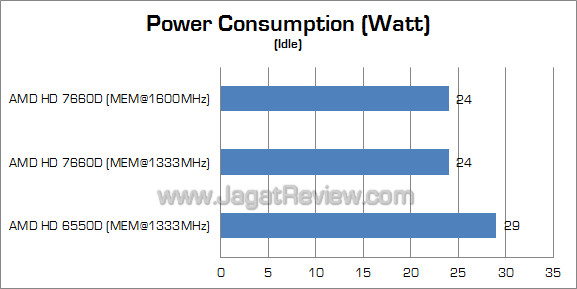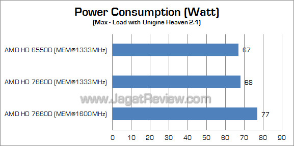 Meskipun menawarkan performa lebih tinggi, konsumsi daya HD 7660D pada kondisi full-load tidak berbeda jauh dengan konsumsi daya HD 6550D. Bahkan pada kondisi idle konsumsi daya HD 7660D berada di bawah HD 6550D. Sementara itu, peningkatan kecepatan memori harus dibayar dengan peningkatan konsumsi daya sekitar 13% (9 Watt).