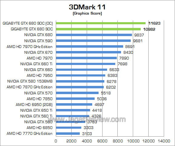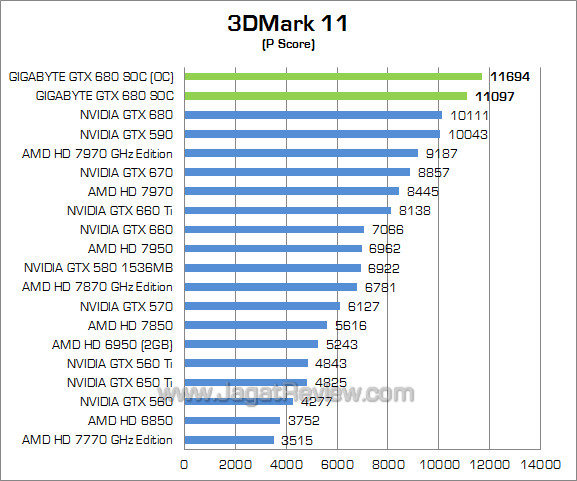Setting : Performance Preset Pada benchmark sintesis DirectX 11 ini, Gigabyte GTX 680 SOC memiliki performa 11% lebih tinggi dibandingkan GTX 680 reference. Dengan meng-overclock, performa Gigabyte GTX 680 SOC meningkat lagi hingga sekitar 5%.