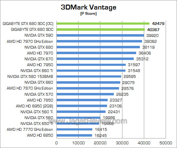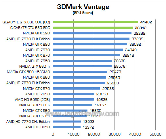 Setting : Performance Preset; PPU Off Benchmark sintesis DirectX 10 ini memperlihatkan Gigabyte GTX 680 SOC memiliki performa 7% lebih tinggi dibandingkan GTX 680 reference. Sementara itu setelah di-overclock, performa Gigabyte GTX 680 SOC dapat naik lebih tinggi lagi sekitar 6%.