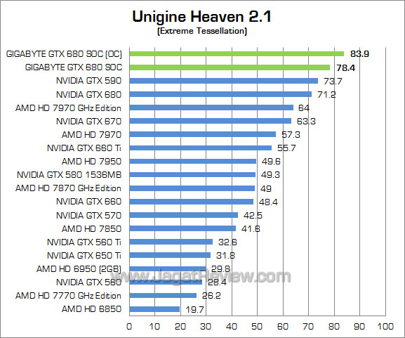Setting : 1920×1080; DirectX 11; High; AF x16, No-AA Gigabyte GTX 680 SOC terlihat memiliki performa 10% lebih bertenaga pada benchmark yang menguji Tessellation DirectX 11 ini. Sedangkan setelah di-overclock, Gigabyte GTX 680 SOC dapat lebih kencang lagi sekitar 7%.