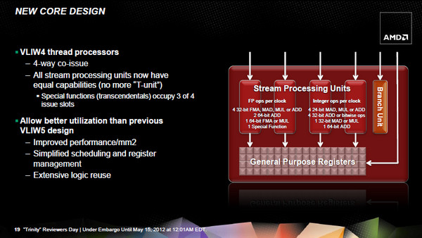 Jika unit GPU APU Llano menggunakan arsitektur VLIW5, maka unit GPU APU Trinity menggunakan arsitektur VLIW4. Arsitektur VLIW4 merupakan arsitektur yang juga digunakan pada graphics card AMD seri HD 6900. Unit GPU dengan codename Devastator ini dilengkapi 384 Stream Processor, 24 Texture Units, dan 8 ROP Units. Cukup mengejutkan ternyata jumlah Stream Processor lebih sedikit dibandingkan Sumo yang memiliki 400 Stream Processor. Apakah hal ini menjadikan performa Devastator lebih lambat dibandingkan Sumo? Kita akan melihatnya pada sesi pengujian di artikel berikutnya.