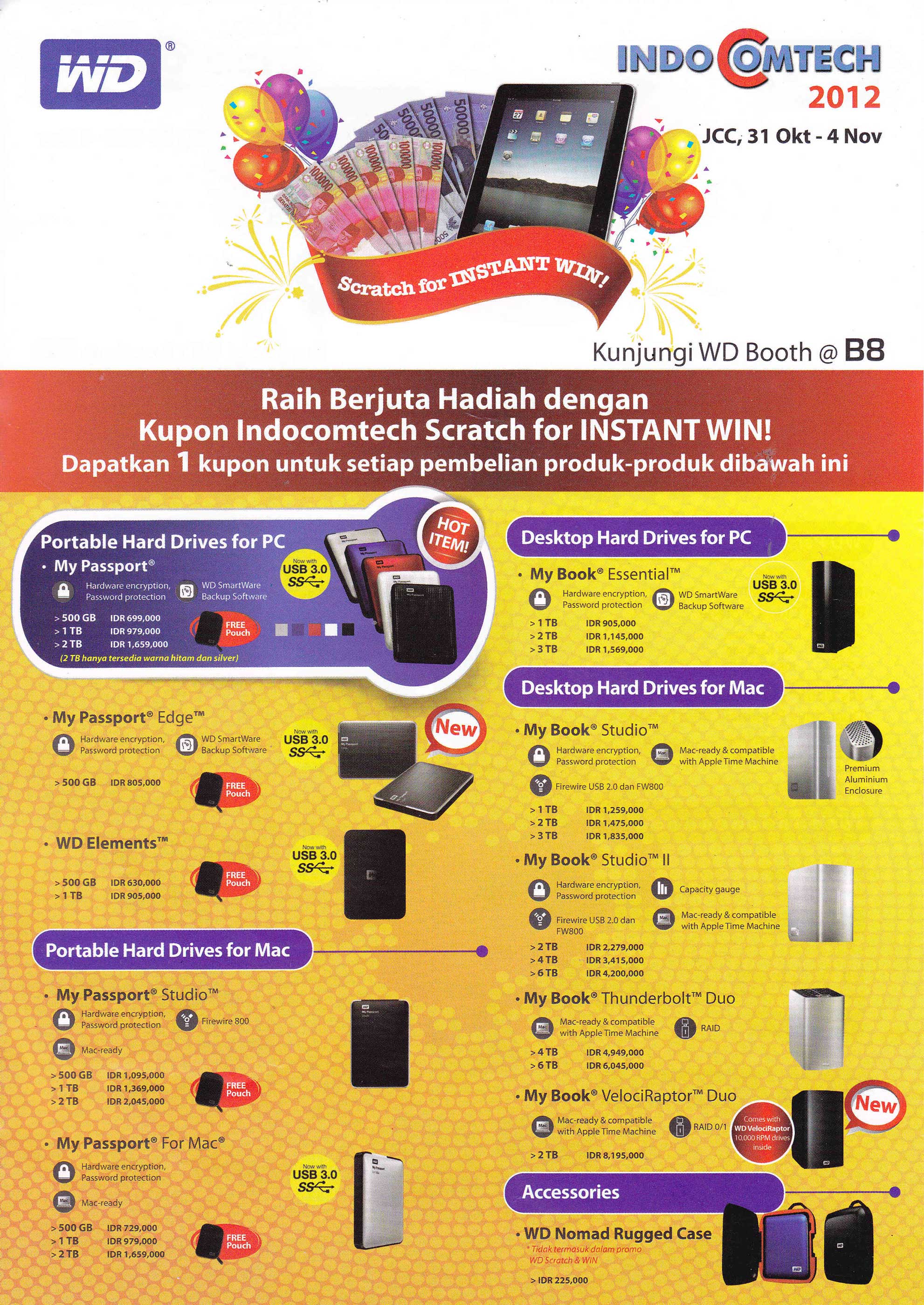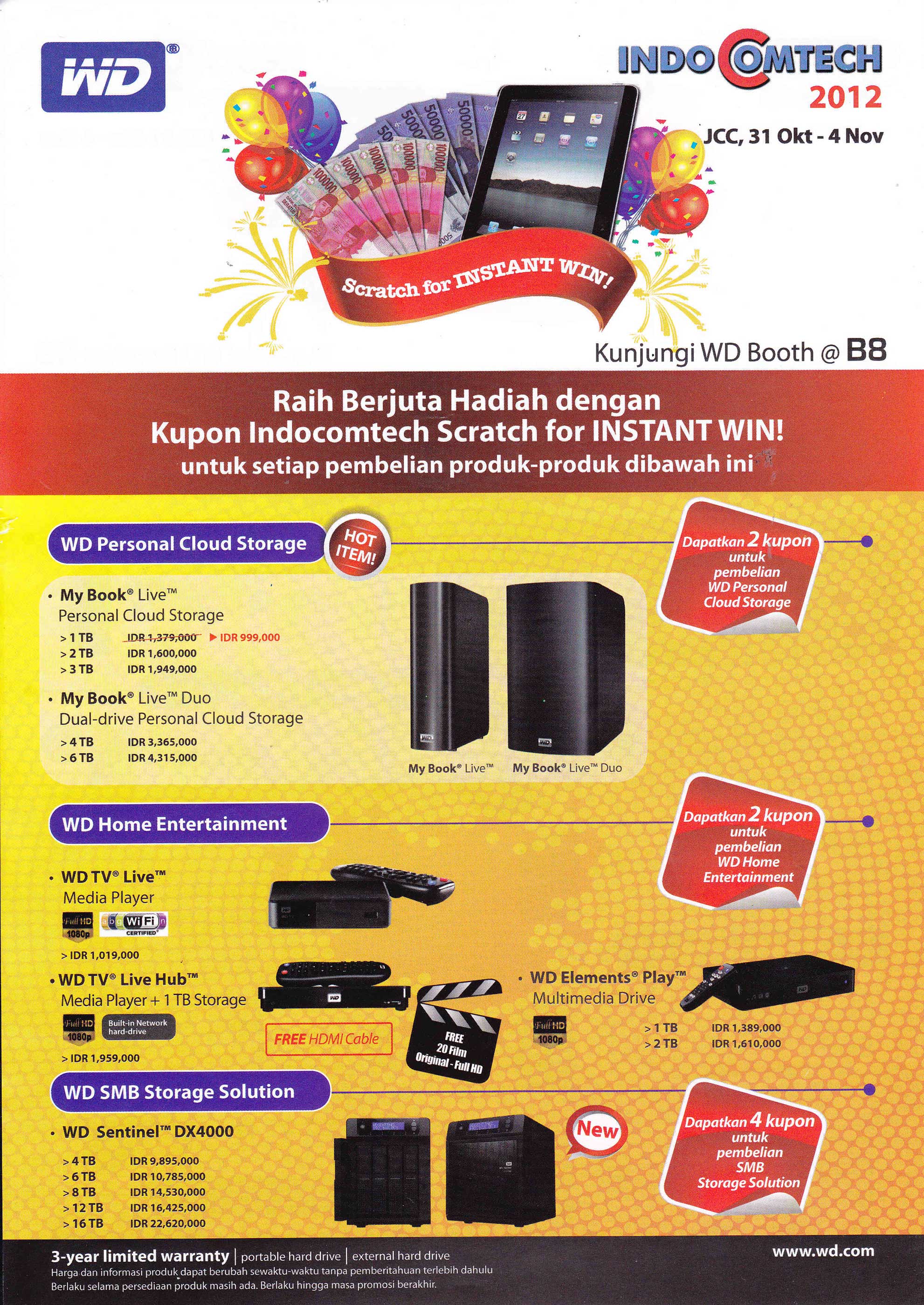 Indocomtech 2012 memang menjadi salah satu event terbaik untuk mendapatkan berbagai perangkat teknologi informasi. Di event tersebut, biasanya para distributor memberikan diskon yang besar. Apalagi dengan hadirnya banyak perangkat baru yang sedang tren saat ini, maka momen ini dirasa cocok bagi Anda untuk berbelanja. Setelah sempat memberikan kepada Anda berbagai promo terkait notebook, PC, dan komputer tablet, kali ini JagatReview akan memberikan beberapa penawaran yang cukup menarik untuk storage dan beberapa perangkat lainnya.