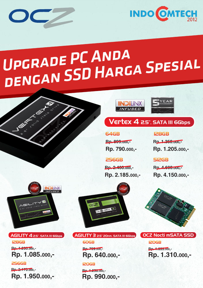 - Vertex 4 2.5″ SATA III 6Gbps 256 GB: Rp 2.400.000,- menjadi Rp 2.185.000,-