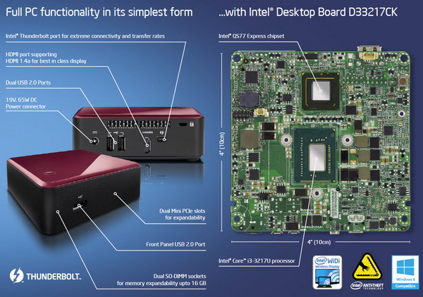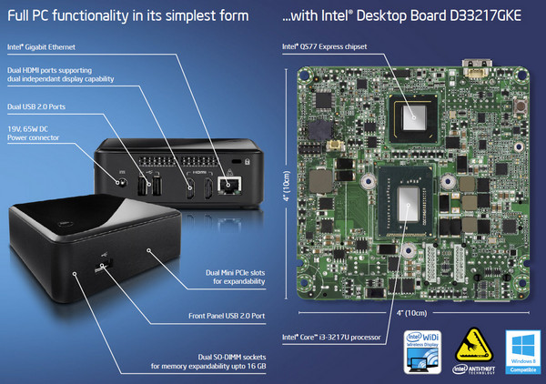 Terdapat dua tipe barebone NUC yang akan ditawarkan Intel yaitu DC3217IYE dan DC3217BY yang dimotori prosesor Intel Core i3 3217U (1.8 GHz, 3MB chace, 17 Watt TDP). Graphics card yang digunakan adalah Intel HD 4000 dengan motherboard chipset QS77. Dua barebone NUC ini dilengkapi 2 buah slot memori DDR3 tipe SO-DIMM, sebuah slot mSATA untuk SSD, dan sebuah slot mini PCIe untuk modul Wi-Fi/Bluetooth.