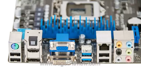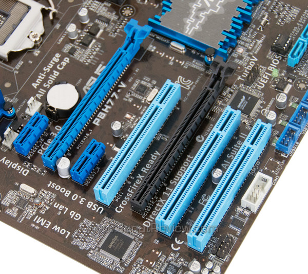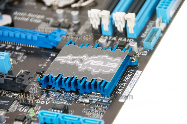ASUS menyediakan 2 buah port SATA 6Gbps (putih) dan 4 buah port SATA 3Gbps (biru) yang diakomodir chipset Intel H77.