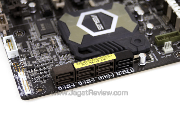 ASUS menyediakan 6 buah port SATA 6Gbps (coklat) yang diakomodir chipset southbridge SB950 dan 2 buah port SATA 3Gbps (hitam) yang diakomodir chip JMicron JMB362.