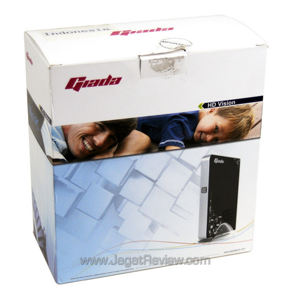 Kemasan produk Giada Mini PC i53 tampil sederhana dengan balutan warna putih dan biru cerah.