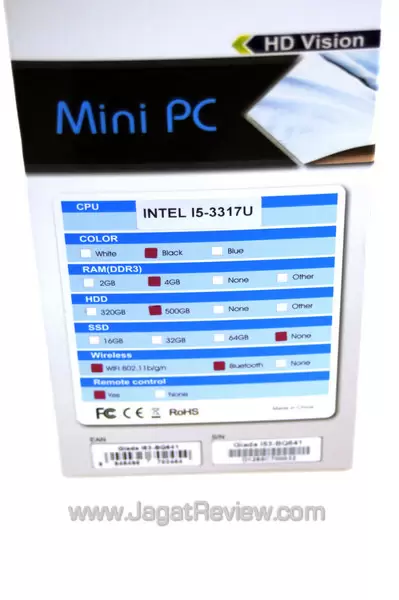 Pada sisi samping kemasan terpampang spesifikasi Giada Mini PC i53 yang ada di dalam kotak ini, termasuk warna yang digunakan. Melihat gambar di atas sepertinya Giada Mini PC i53 tersedia dengan storage HDD dan juga SSD. Produk Giada yang kami terima menggunakan HDD berukuran 500 GB.