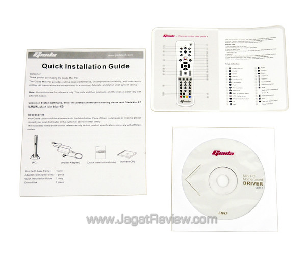 Giada menyertakan buku manual berisi cara pemasangan sistem, buku manual penggunaan remote, dan sebuah DVD berisi driver.