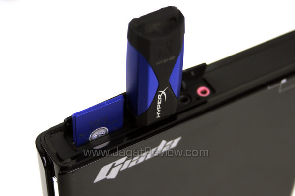 Di sisi atas terdapat sebuah pintu kecil. Jika dibuka di dalamnya terdapat sebuah card reader (SD/MMC/MS/MS PRO), port USB 3.0, port audio out (hitam), dan port audio in/microphone (merah muda).
