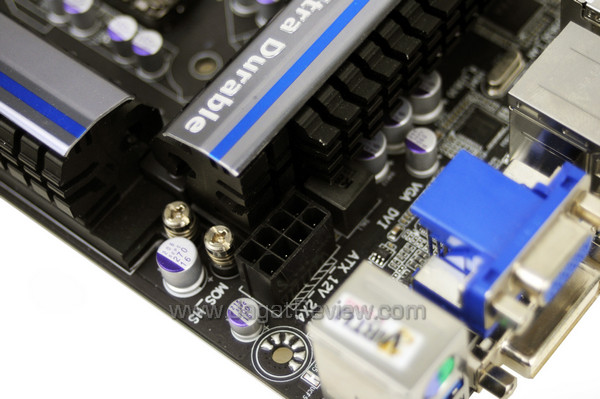 Soket prosesor LGA1155 dikelilingi komponen khas Ultra Durable 5 seperti Lower ESR solid capacitor dan Ferrite Core Choke. Terdapat 10 buah Ferrite Core Choke dengan kapasitas 60 A untuk setiap choke. Tepat disamping deretan choke adalah heatsink pasif untuk mendinginkan komponen VRM di bawahnya. Di balik heatsink tersebut tersembunyi chip Power Stage buatan International Retricfier, IR3550 PowIRstage dengan kapasitas 60 A. Di dalam chip Power Stage terdapat sebuah MOSFET driver, high-side MOSFET, dan low-side MOSFET. Dibandingkan komponen MOSFET pada umumnya, penggunaan chip ini diklaim mampu menghasilkan temperatur kerja lebih rendah, efisiensi daya lebih baik, dan juga kestabilan lebih baik saat melakukan overclocking. Tidak hanya itu, kapasitas chip tersebut tergolong besar mengingat MOSFET lainnya hanya memiliki kapasitas berkisar 35-40 A. Gigabyte Z77-UP4 TH menyediakan 4 buah slot memori DDR3 dengan konfigurasi dual-channel. Motherboard ini mendukung kapasitas memori hingga 32 GB (8 GB per slot) dan kecepatan memori hingga >2400 MHz (membutuhkan keping memori yang mendukung dan overcloking manual). Tidak jauh dari slot memori terdapat sebuah USB 3.0 header (chipset Intel Z77) untuk tambahan 2 port. Motherboard ini menggunakan konektor daya 8-pin untuk menjamin kecukupan suplai daya ke prosesor terutama saat melakukan overclocking. Heatsink pasif ini bertugas menjaga temperatur chipset Intel Z77 tetap berada pada batas normal.